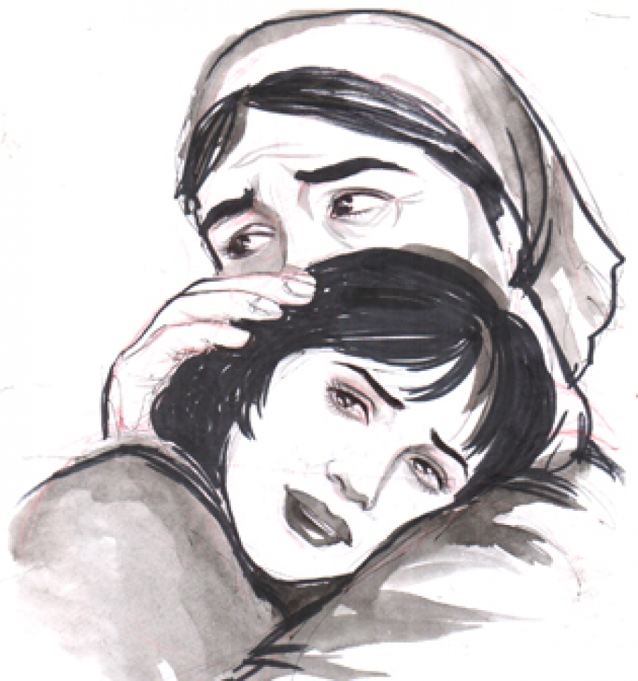 Қизлар ҳам аввалига отасининг меҳридан бироз умид қилишиб ёнларига киришди, бироқ унинг жаҳли чиқиб, қовоғи уйилганидан ўз ётоқхоналарига кириб кетишди. Ҳеч қанча вақт ўтмай эса уй ичидан калтак еган оналарининг дод-войи эшитилди. Қизлари югуриб чиқишганида онасининг ҳамма ёғи маматалоғ бўлган, бурни қонаган, сочлари тўзиган ҳолда турарди. Хуморидан тушган отаси эса атрофга эътибор қаратмасдан ўз хонасига кириб кетди.