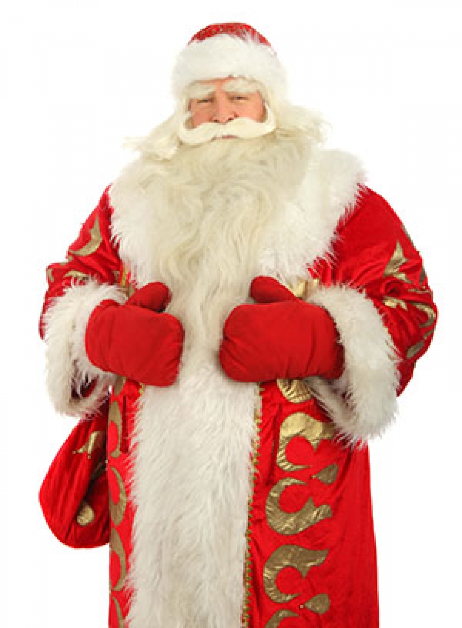 Санта - ўрта ёшлардаги хушмуомала эркак. У калта қизил иштон ва алвон поча пўстинда намоён бўлади. Санта Клаус буғуларга қўшилган чанада ўзининг ёрдамчилари - элф ва гномлар билан бирга келади. Келиб   чиқиши Лапландиядан.